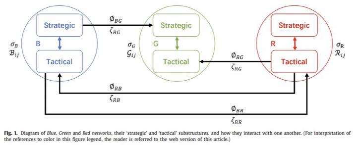 We consider a model of three interacting sets of decision-making agents, labeled Blue, Green and Red, represented as coupled phased oscillators subject to frustrated synchronisation dynamics. The agents are coupled on three networks of differing topologies, with interactions modulated by different cross-population frustrations, internal and cross-network couplings. The intent of the dynamic model is to examine the degree to which two of the groups of decision-makers, Blue and Red, are able to realise a strategy of being ahead of each others’ decision-making cycle while internally seeking synchronisation of this process – all in the context of further interactions with the third population, Green. To enable this analysis, we perform a significant dimensional reduction approximation and stability analysis. We compare this to a numerical solution for a range of internal and cross-network coupling parameters to investigate various synchronisation regimes and critical thresholds. The comparison reveals good agreement for appropriate parameter ranges. Performing parameter sweeps, we reveal that Blue’s pursuit of a strategy of staying too-far ahead of Red’s decision cycles triggers a second-order effect of the Green population being ahead of Blue’s cycles. This behaviour has implications for the dynamics of multiple interacting social groups with both cooperative and competitive processes.